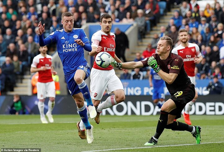 Leicester City move into a 2-0 lead through a Jamie Vardy header. Sokratis doesn’t deal with the ball over the top and Vardy’s initial chip over the goalkeeper rebounds off the crossbar and into his path. Sokratis then doesn’t get off the goal line quick enough and Leno can’t get a hand to block the forward’s header as he fires it into the back of the net.