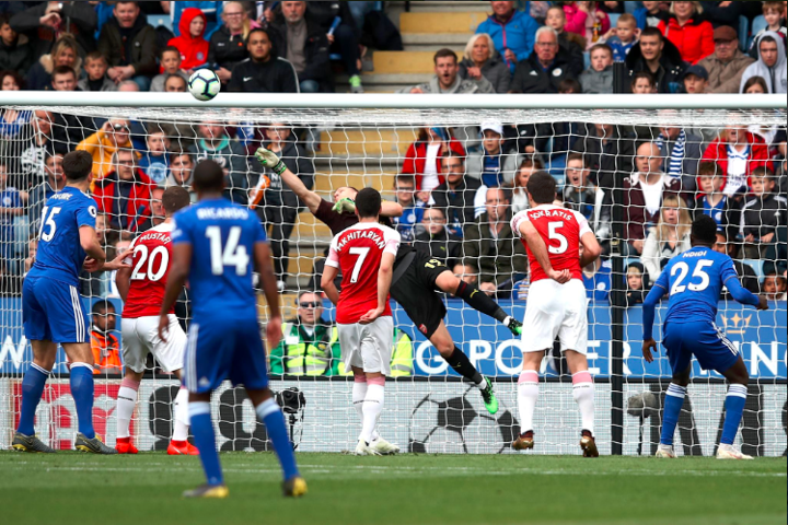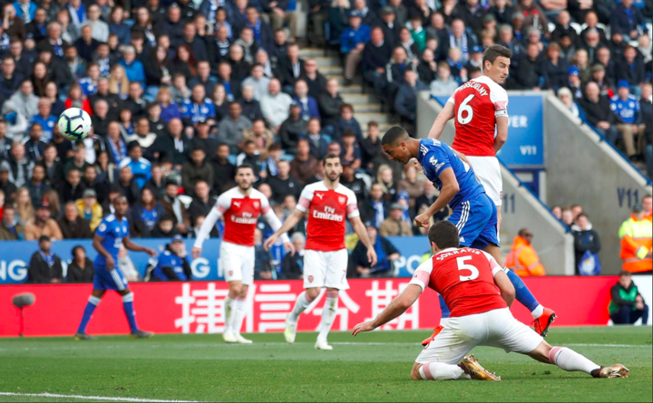 He was the furthest player forward for Leicester when he’s picked out by Albrighton and he gets ahead of Sokratis to chip the ball over Leno towards the goal. It doesn’t have enough dip on it though and it flies over the crossbar.