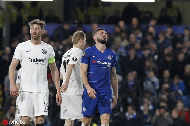 WIDE! Hazard runs at the Frankfurt defence before backheeling his pass to Giroud on the charge. The Frenchman goes for goal with the outside of his boot, but he places his effort comfortably wide of the target.